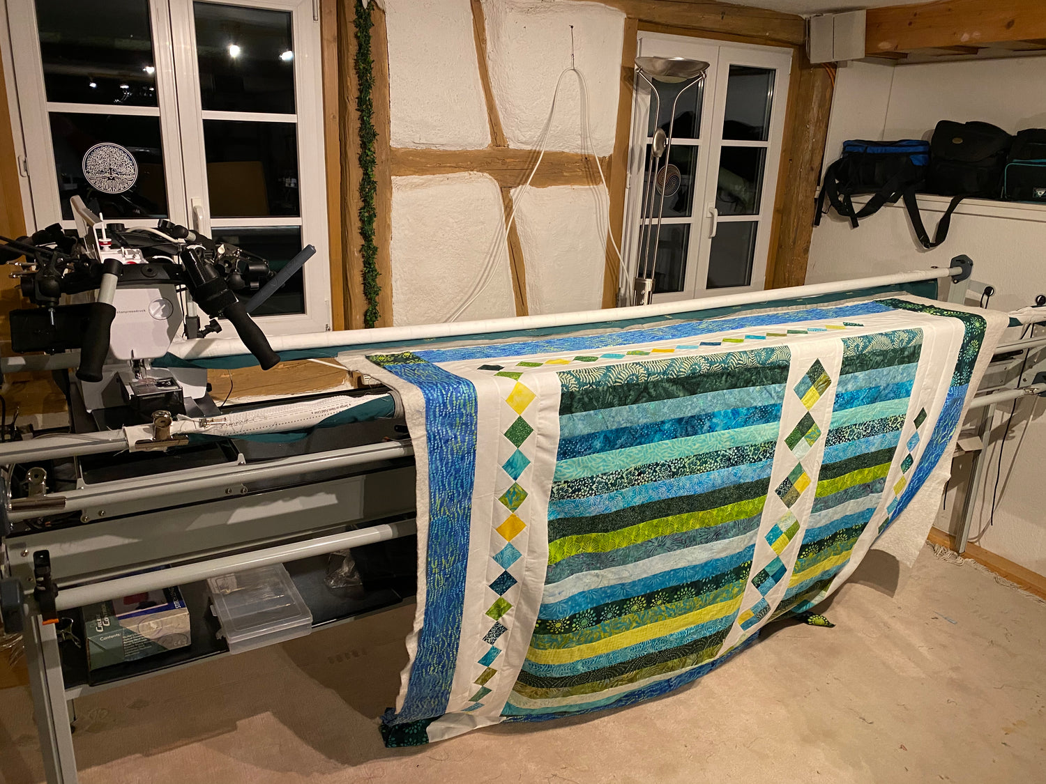 Auf meiner großen Quilt-Maschine können Decken bis 3,50 m Breite gesteppt werden.