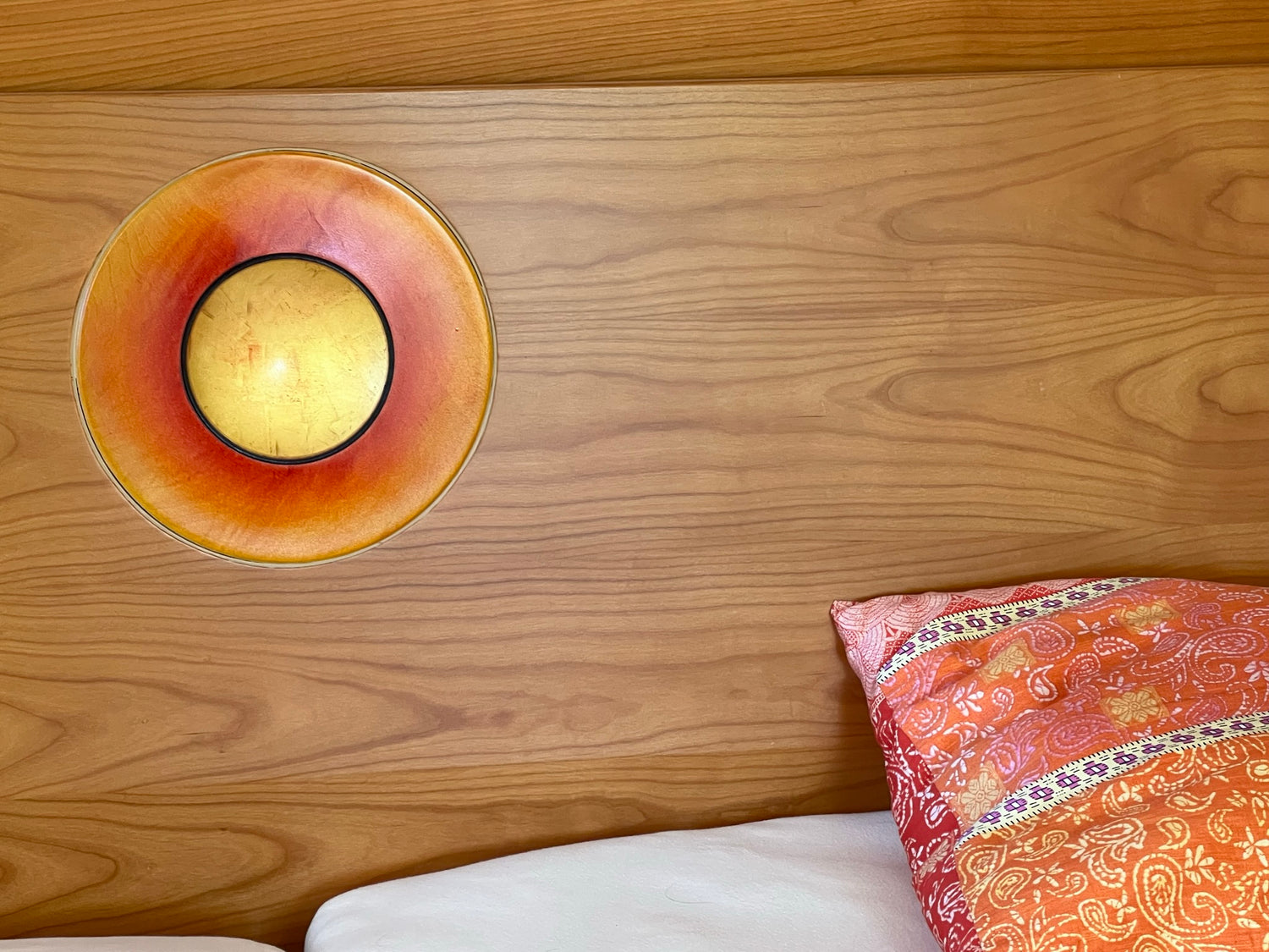 Hier wurde eine Ahornschale mit Gelb-Orange-Tönen und schwarzem Rand in ein Bettgestell integriert.