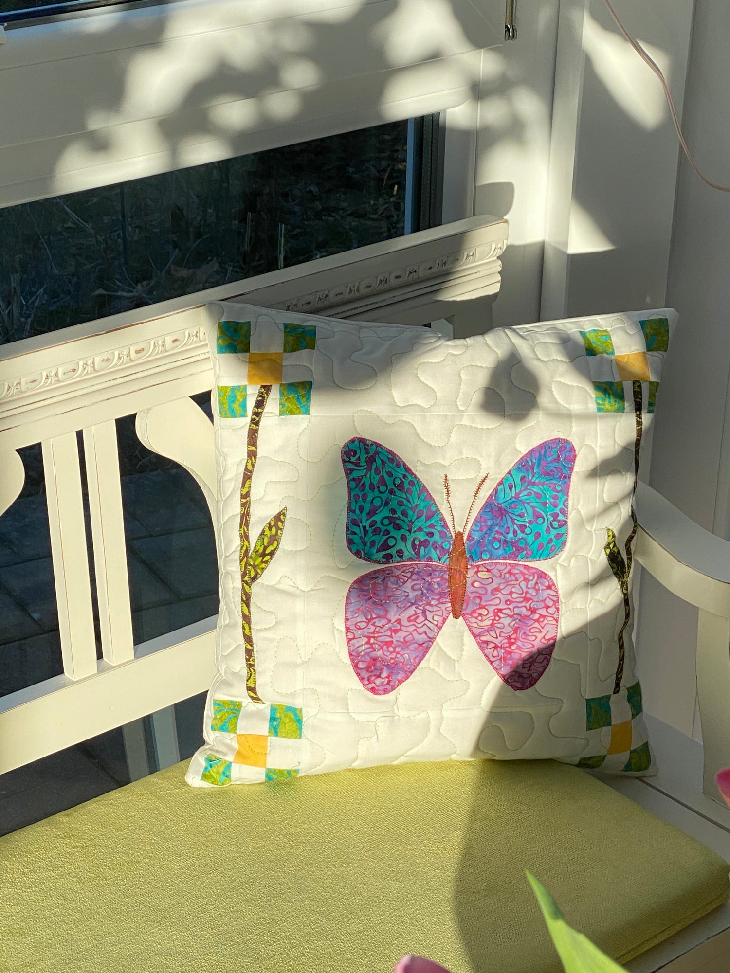 Das ganz besondere Kissen. Ein Schmetterling aus Bali-Batiken auf weißem Untergrund. Sehr vornehm.