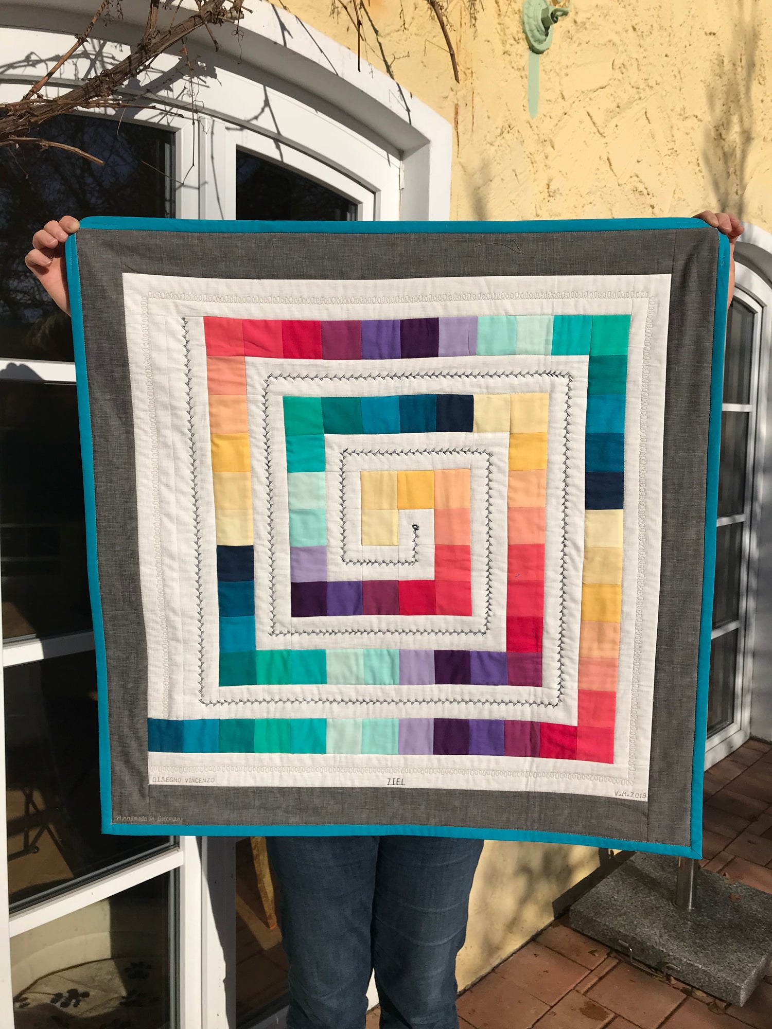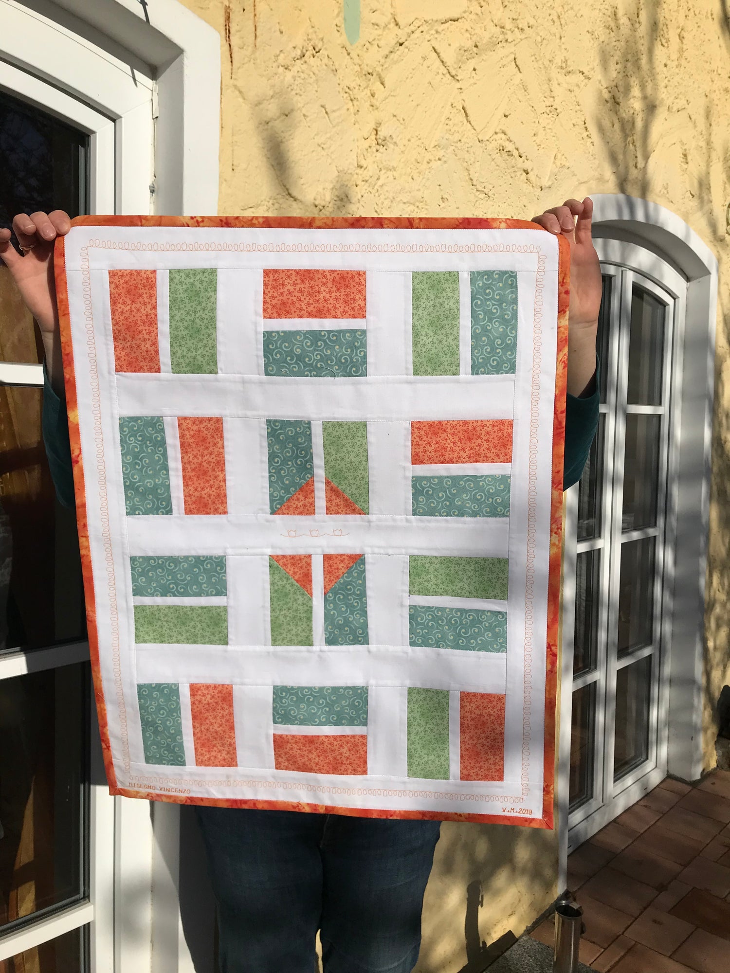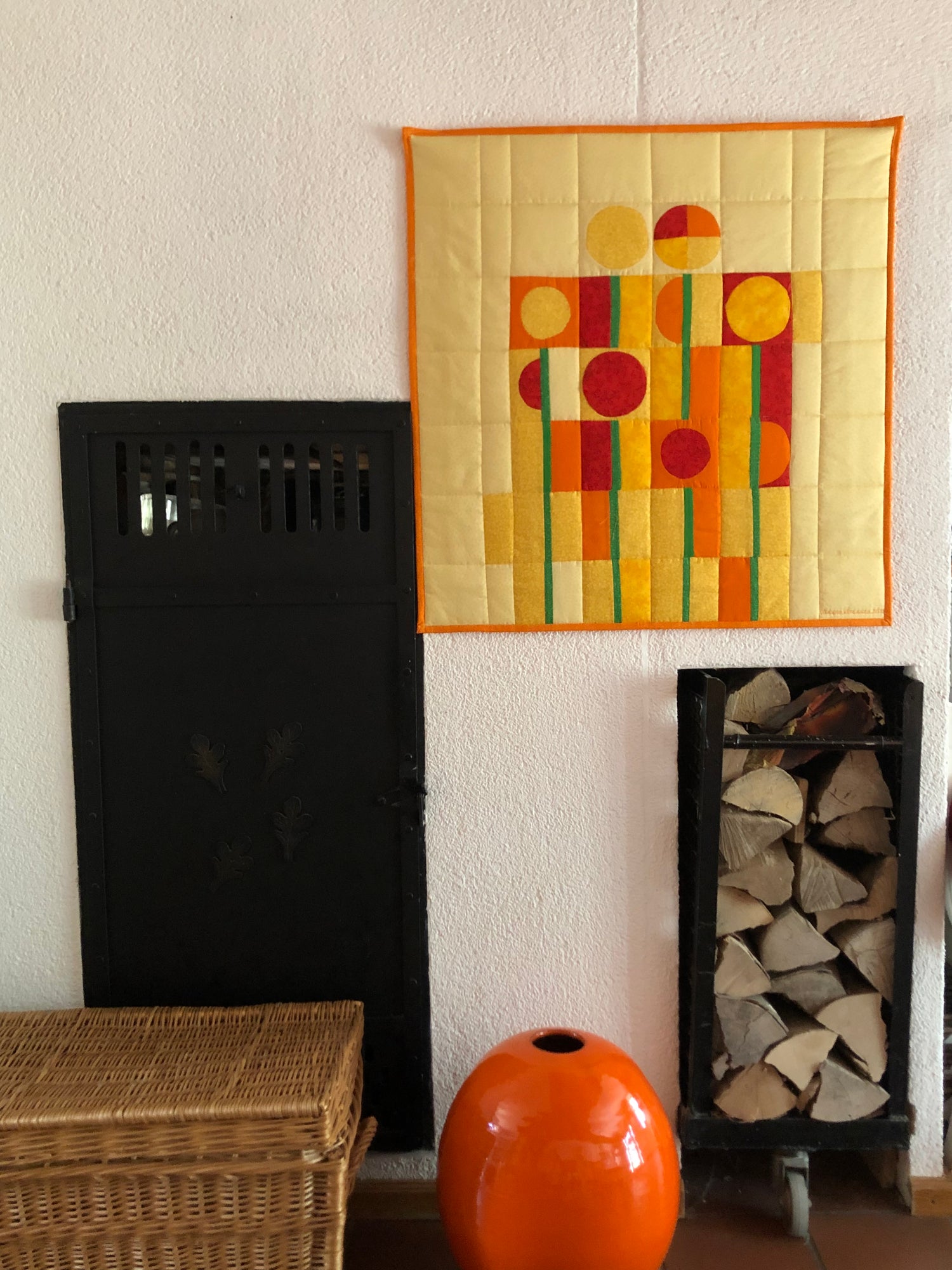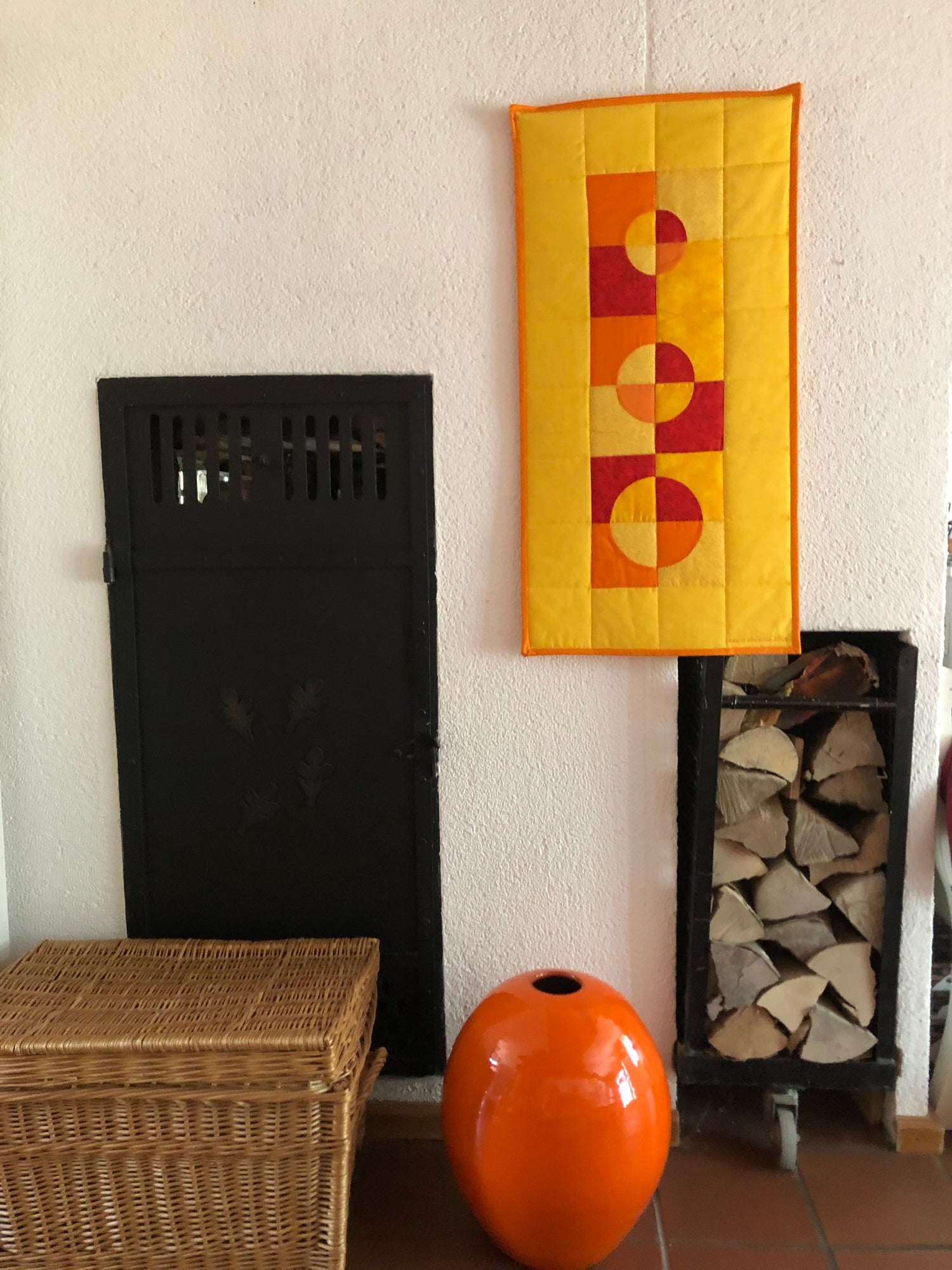 Als Tischdecke oder Wandbehand gibt dieser Quilt einen Farbakzent in einer ansonsten sehr aufgeräumten Wohnung.