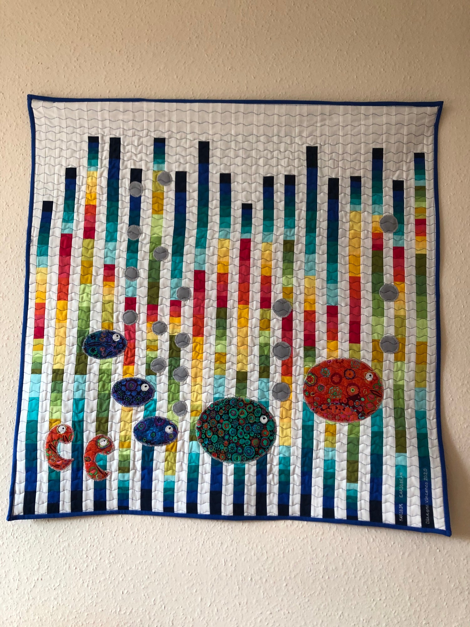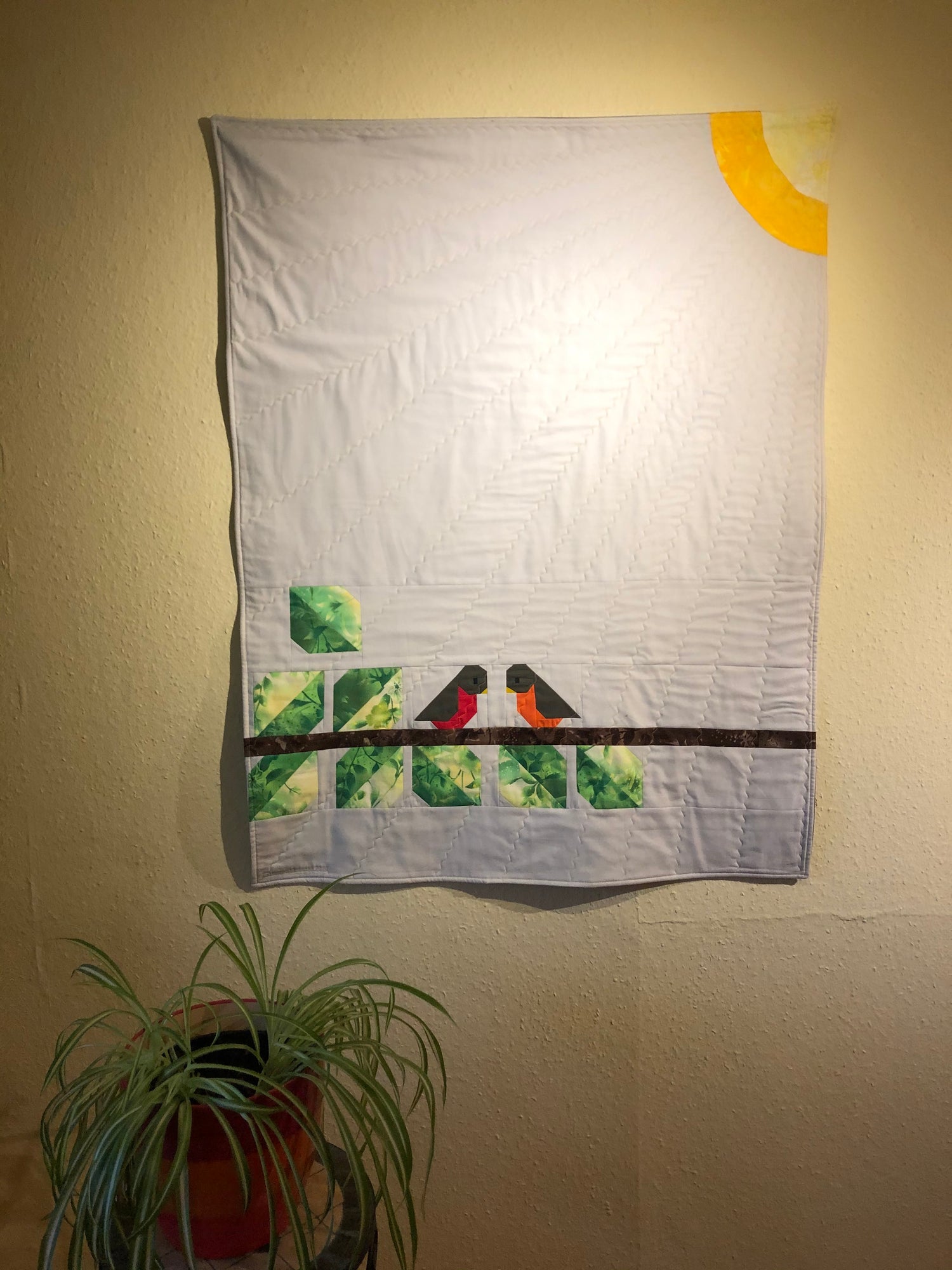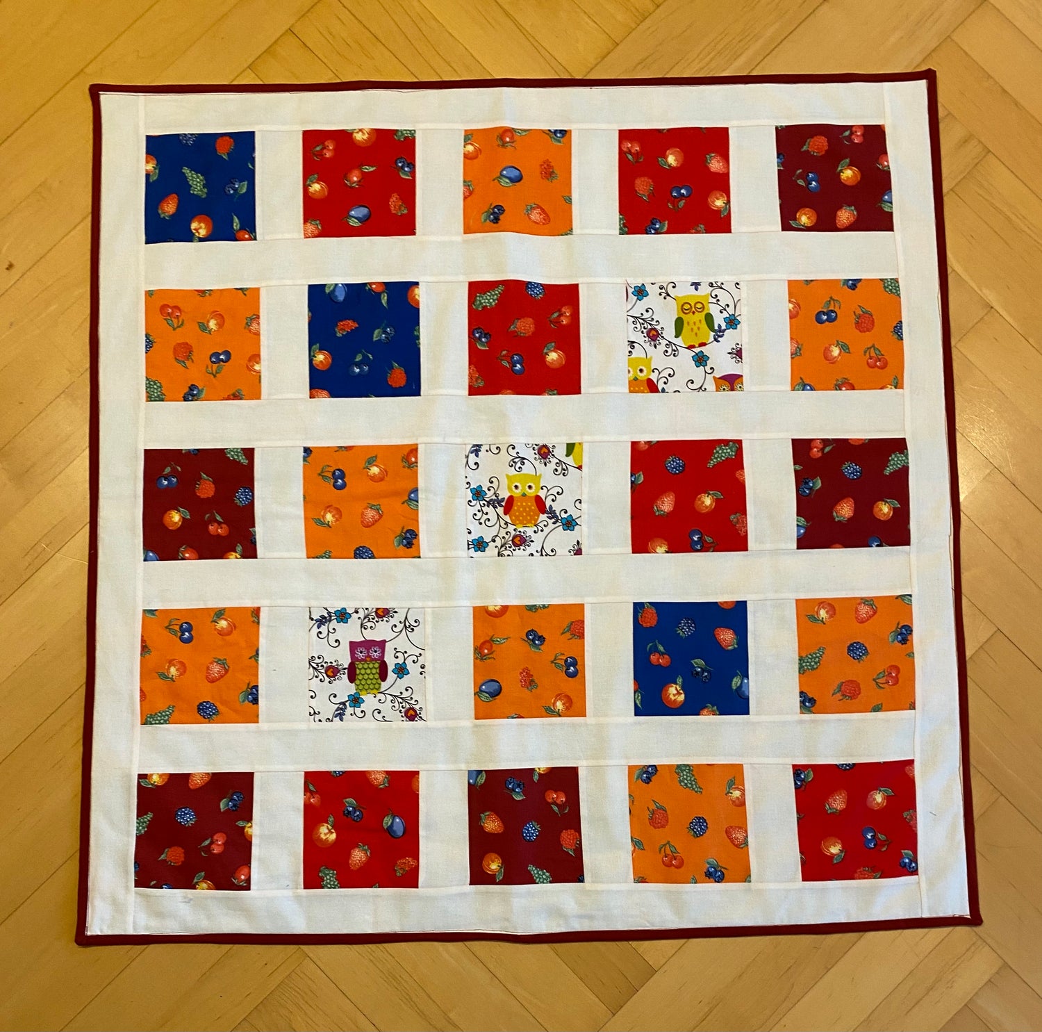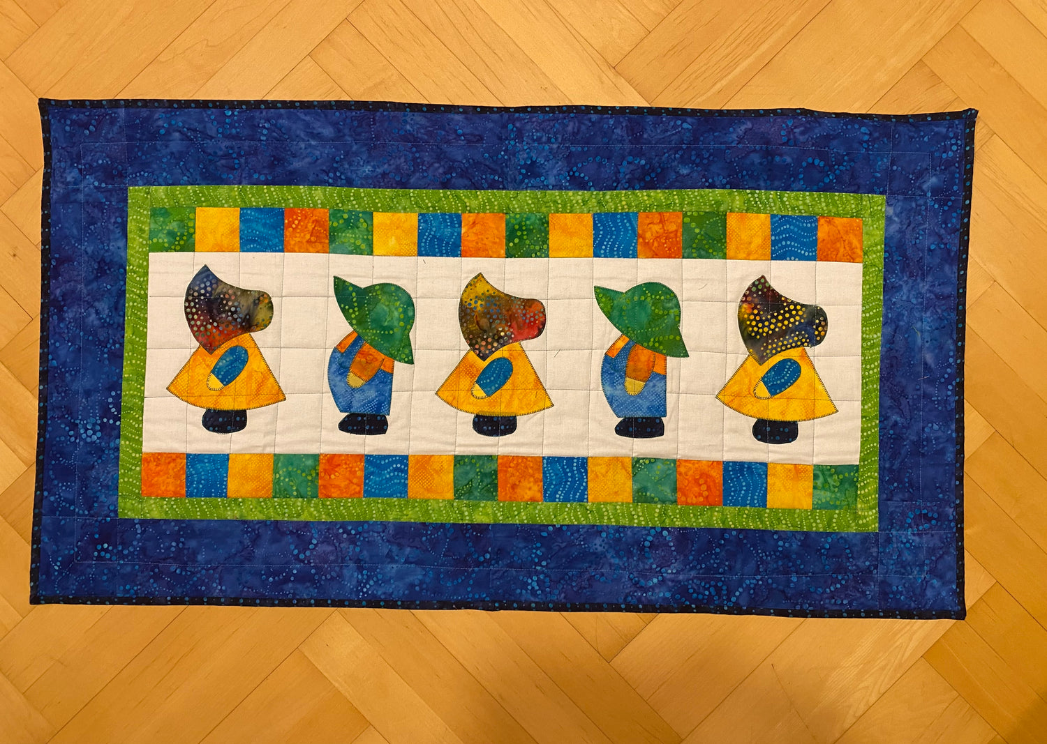 Als Tischdecke oder Wandbehand gibt dieser Quilt einen Farbakzent in einer ansonsten sehr aufgeräumten Wohnung.