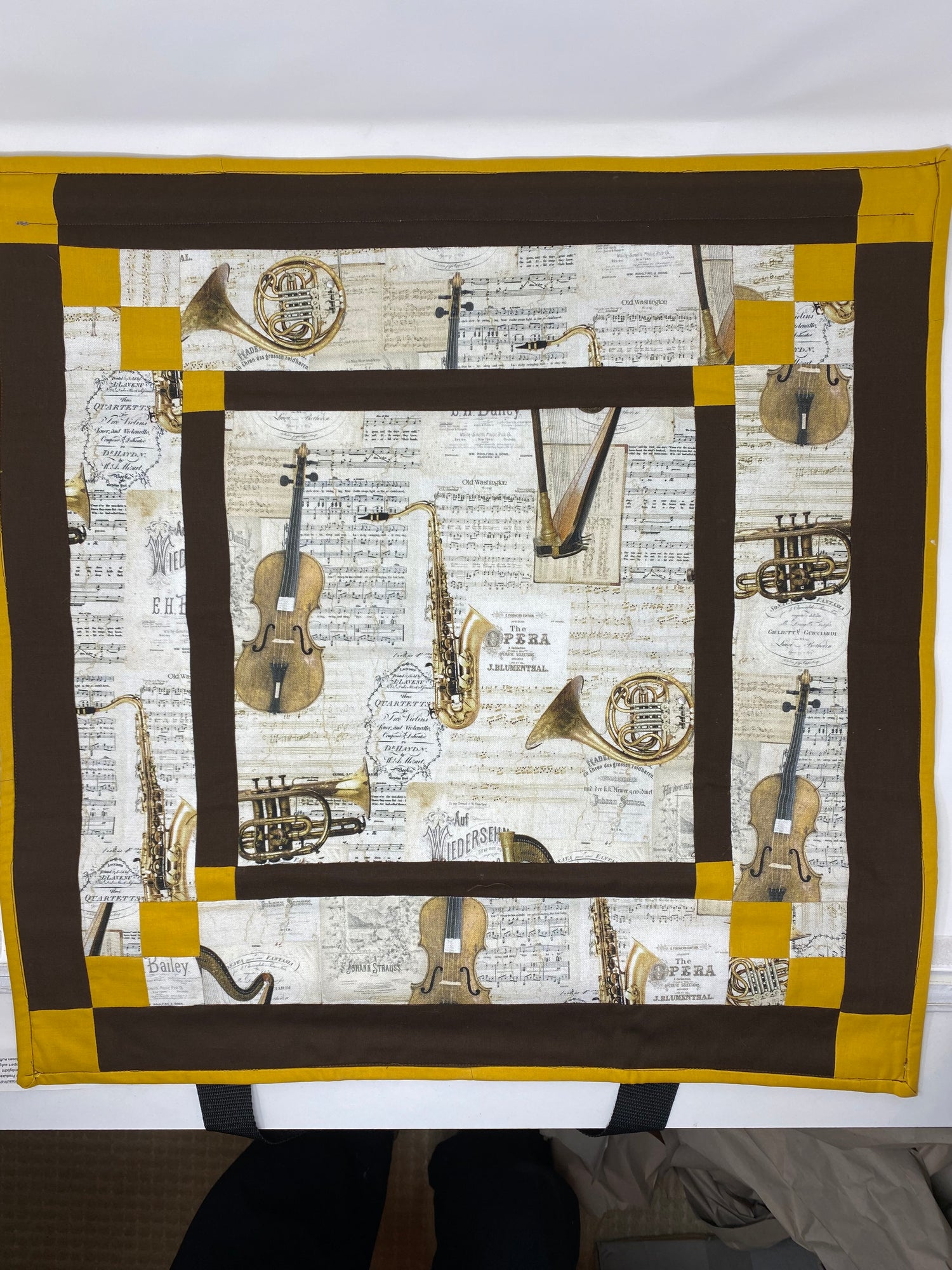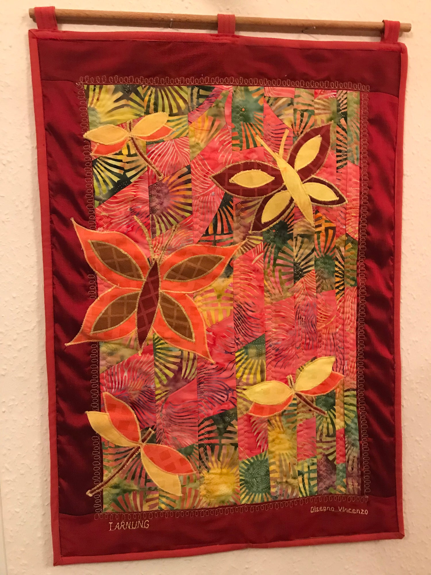 Ein Tischläufer in gelb-roten Farben, der auch an die Wand gehängt werden kann.