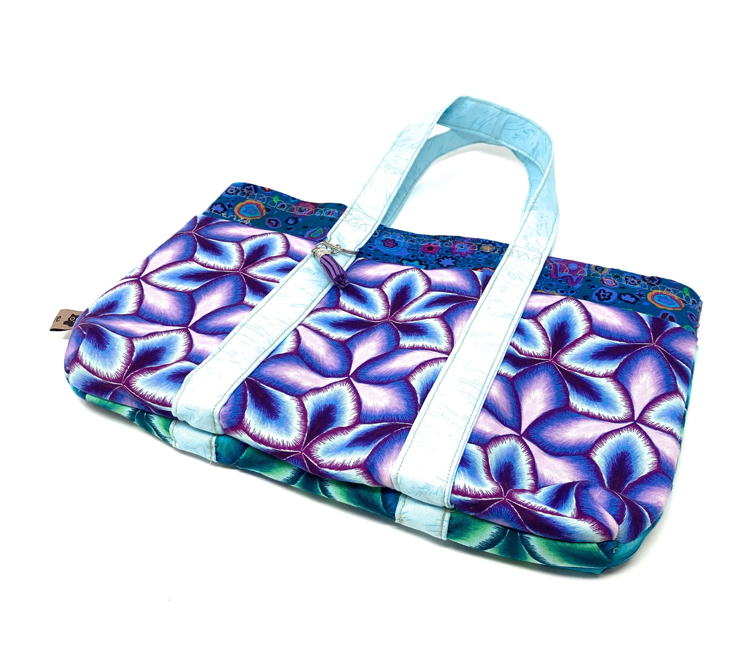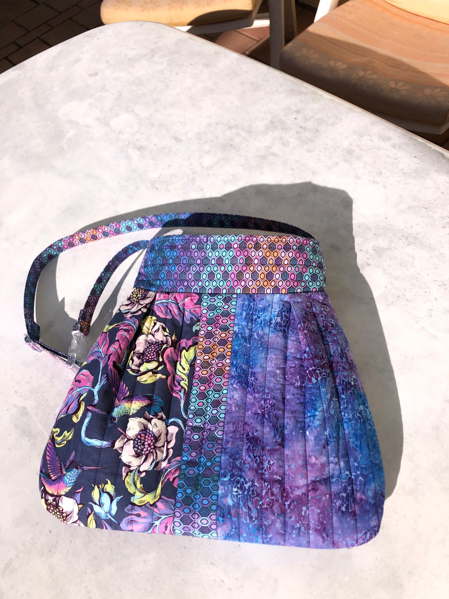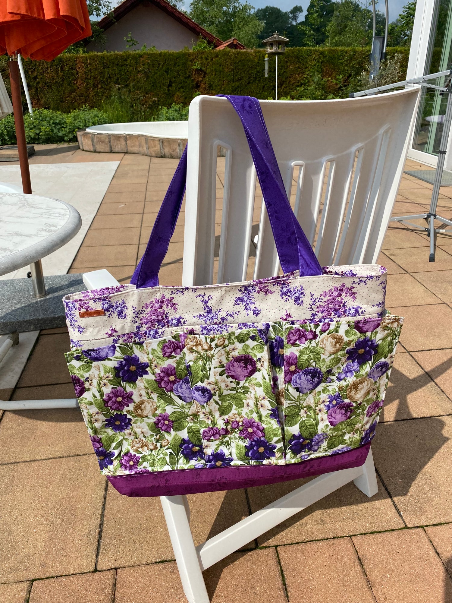 Diese violette Tasche kann gewendet werden, so dass die 4 senkrechten Taschen an den Seiten innen oder außen sind.
