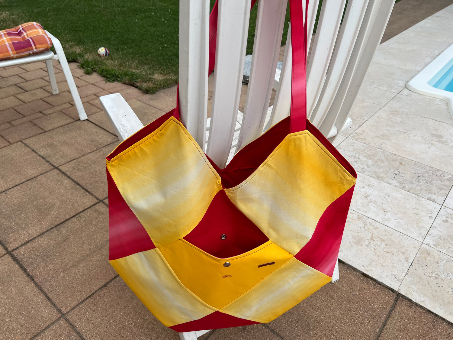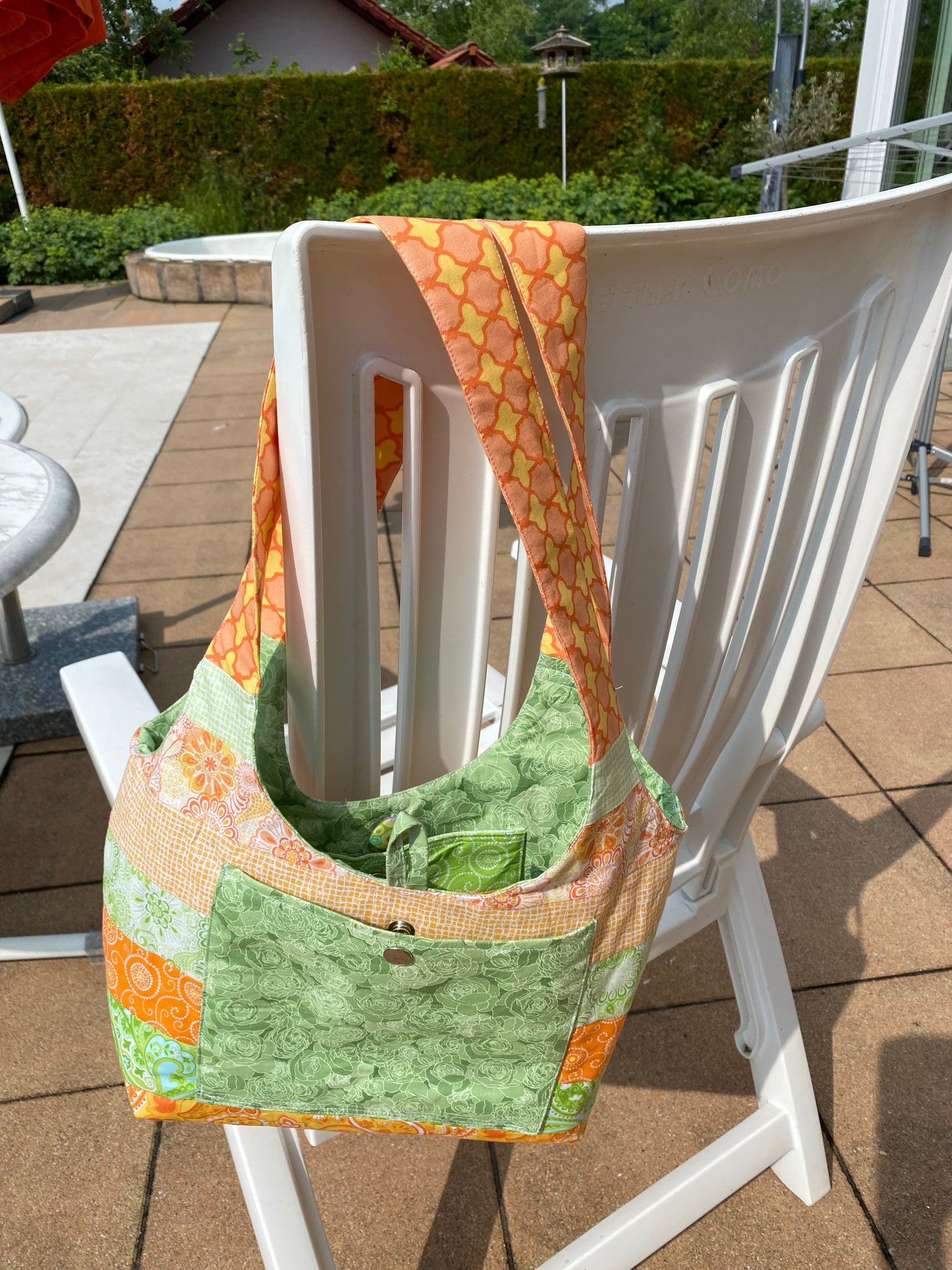 Diese Wendetasche kann in Orange-Tönen oder in Grün getragen werden. Einfach: Bitte wenden!
